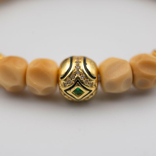 Pulsera de escudo energético con cuentas de semillas Bodhi y detalles dorados ornamentados