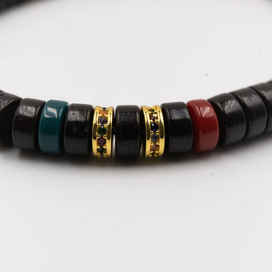 Pulsera de cuentas de vidrio negro con escudo energético de cristal rojo y verde
